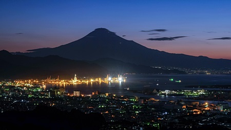 月明りに照らされた駿河富士。そして海沿いロードの光の帯・・・。