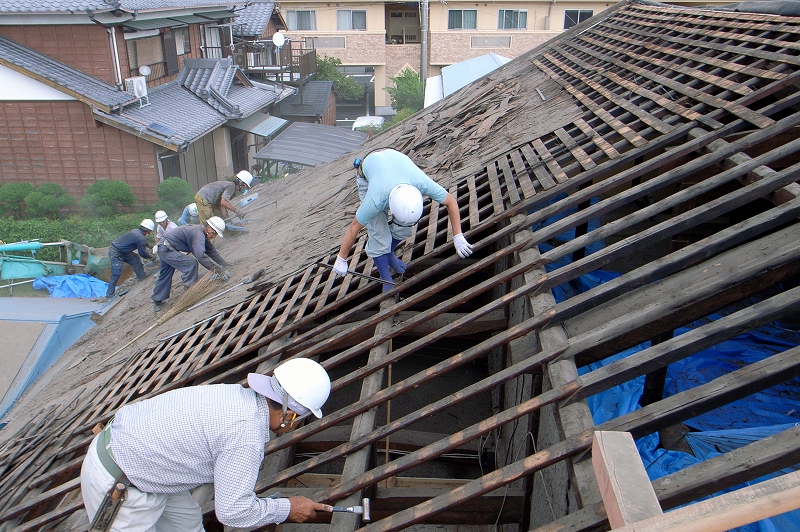現在のように屋根下地に使用する防水性の高いアスファルトルーフィングがこの時代に存在していれば、屋根下地工事にこんなに手間は掛からなかったことでしょう。