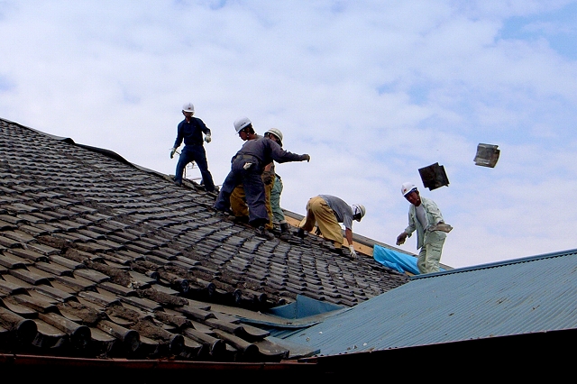先ずは既設の瓦を一枚いちまい剥がしながら撤去していくのですが、数量が半端じゃありません!S邸の屋根面積は400M2に達するのではないかと思うほどの超ウルトラ級!『永建さん!(解体業者の皆さん)張り切っていきましょう!午後一からは大工さん達が新しい屋根下地を張り上げていくのですから!』