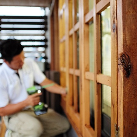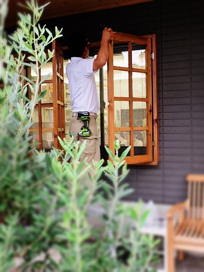 弊社の事務所窓に、木製の飾り窓枠をプラスしてみました。