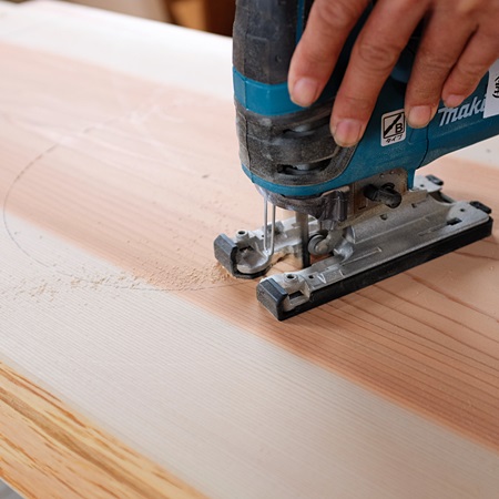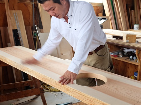 ぶ厚い杉の一枚板に、30センチ程の円を描き、切り抜いていました。