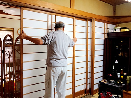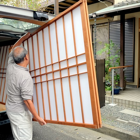 一時建具引き揚げ作業から、張り替え後の建具運搬、そして建具の嵌め込みまで、