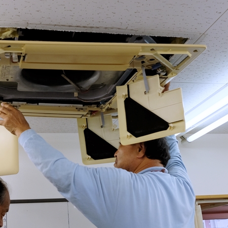 上の画像は、弊社の天井付のエアコンを新しい物に取り替えるために、 既設エアコンを取り外しているところです。