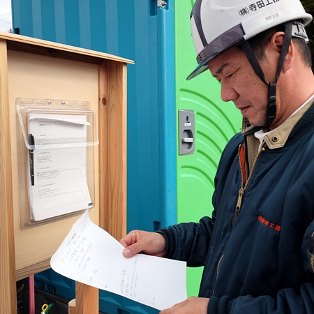 この報告書に、家づくりスタッフ各自が、本日の作業内容や、 その作業の安全指示事項、仮設トイレ清掃状況などなどを、 書き込んでいくシステムとなっています。