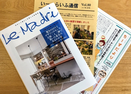 弊社の近況報告(イベント・工事報告等々)と、 毎日の暮らしを明るく快適にしてくれるアイデア一杯の情報誌、 『レ・マドリ』や『ちーずたより』を、 お世話になっているお客様方や、これからご新築・リフォームをお考えになっている方々にお届けさせて頂いております。