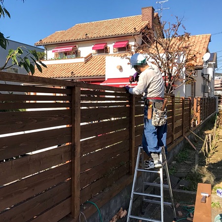 静岡市駿河区にあります、洋菓子処シューマンさんの木製塀のメンテナンス作業を行っています。