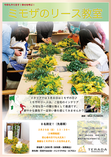 2月25日開催予定の『ミモザのリース作り教室』ですが、