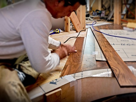 一枚ずつRラインに沿って木取りながら、 ブラックウォールナットの床材を張っていきます。