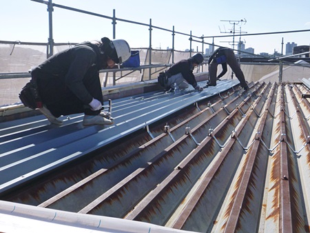 今回は、古くなった既設の折半屋根材の上に、 さらにもう一枚の折半葺き施工とさせて頂きました。