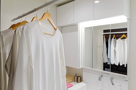 洗面脱衣室の天井に『埋め込まれた』この物干し金物は、 使う時だけ物干しし易い位置まで下げて、お洗濯物を干し、 使い終わったら、天井内へとスッキリと収納!