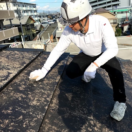 以前ある業者により、屋根瓦表面に塗装を施したようなのですが、 劣化が激しく瓦表面が傷み始めていましたので、 今回その塗膜表面を専用溶剤を使用しながらワイヤーブラシで念入りに除去し、 新たに強固な塗装を施す工事をしています。