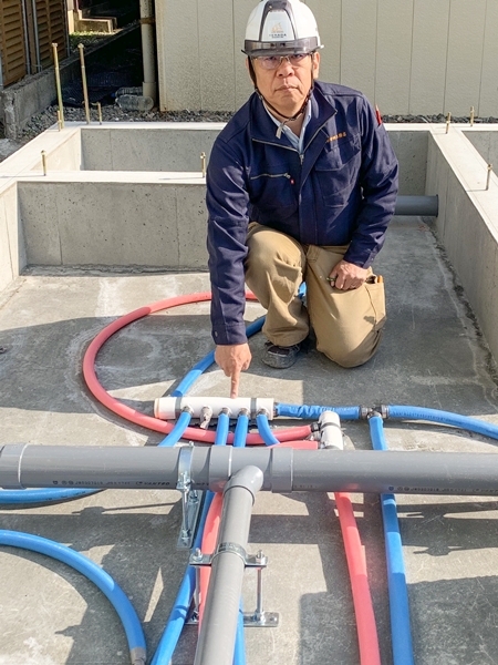 基礎内の給排水配管の設置状況を確認しているところです。