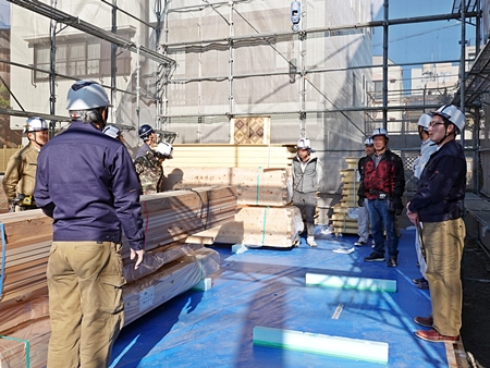 画像は、建て方作業前の朝一ミーティングの様子を撮影したものです。