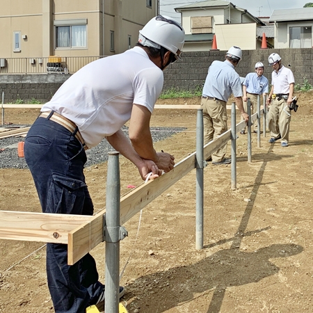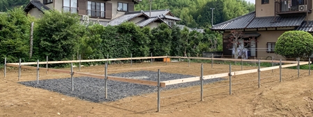 はい!本日は早朝より、「梅雨の晴れ間」を逃すことなく生かして、 『基礎工事』着手前の『遣り方(やり方)』作業を済ましておきました。