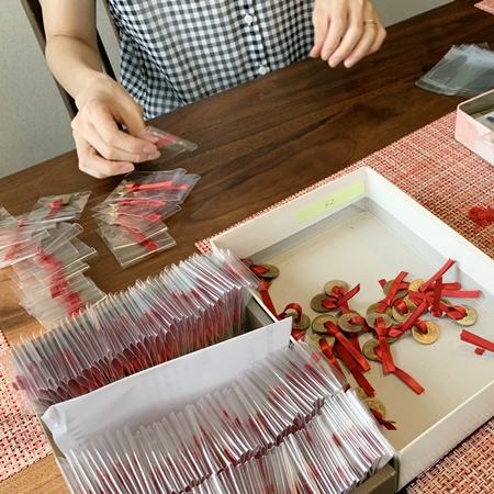 赤い紐を通した五円玉を作っています。
