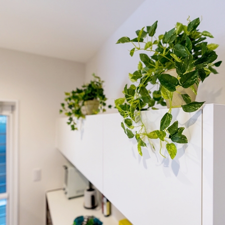 思い切って、 アイレベル部だけの収納量と割り切って吊り戸を使ってみたら、 はい!インテリアとして、 【グリーン】も活用出来て、とても良い雰囲気です。