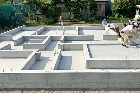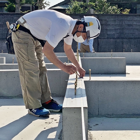 本日は、早朝AM7:30より、 基礎天端に土台を据え付けるための墨出し作業を行いました。