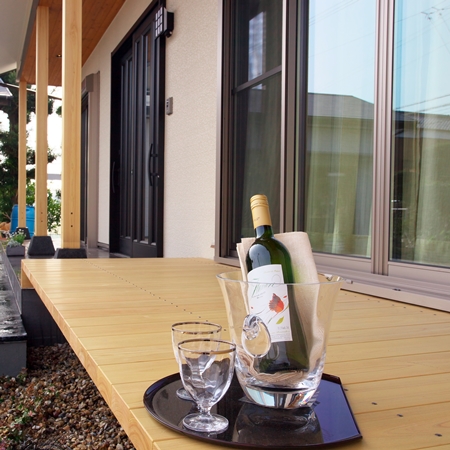 夕涼み・・・。檜の濡れ縁に腰かけて、ワインで乾杯!