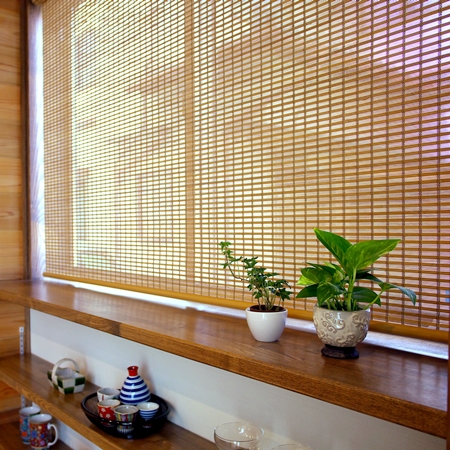 画像は、弊社で設計・施工させて頂きました、 駿河区のO様邸の窓(内側)部を撮影したものですが、 天然木の経木が使われた簾調のロールブラインドです。