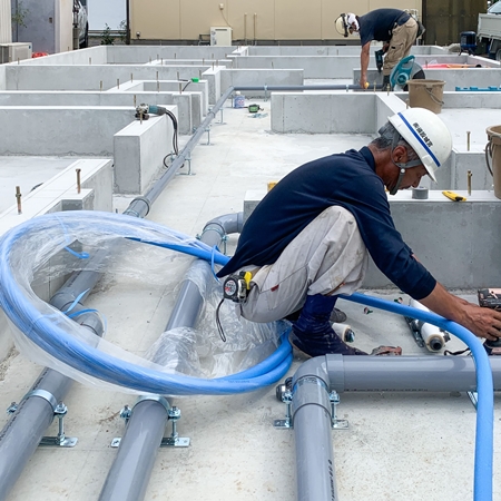 【いい家】を造り上げる上で、家の断熱性・気密性を高めたり、 地震に強い高耐震な家を造り上げることは勿論ですが、 末永く快適にお暮し頂くためのメンテナンスが容易な給排水配管の設計施工にも努めています。
