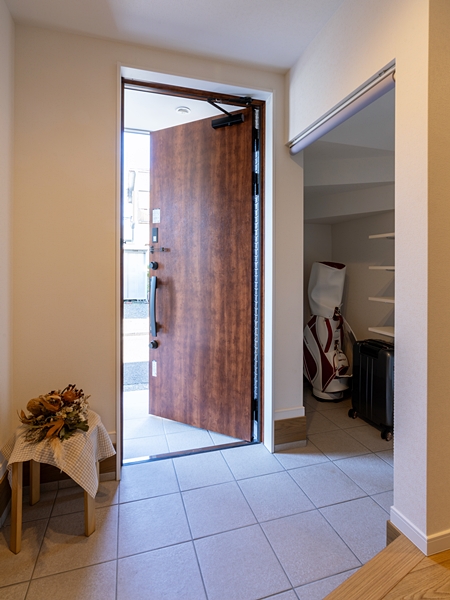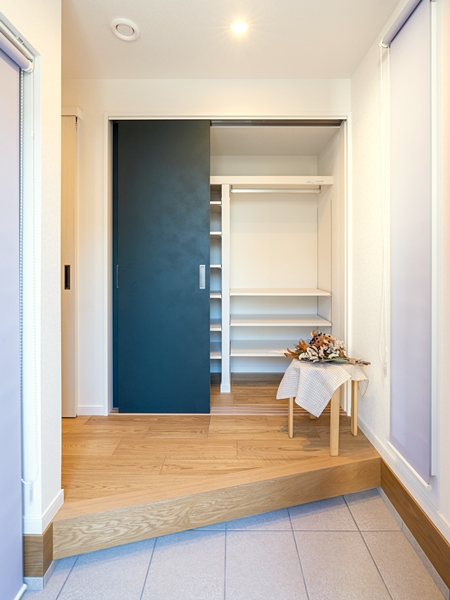 振り返ってみると右手側に、階段下を最大限に利用した玄関土間収納を設けさせて頂きました。