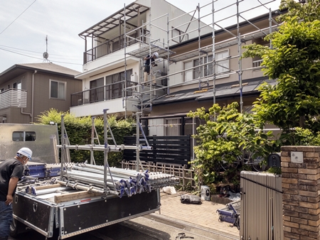 外部足場架設後、先ずは、現状作業をしっかりと行います。