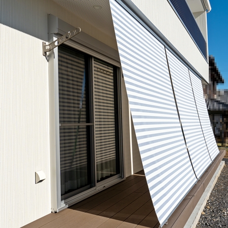 上の画像は、弊社設計施工のI様邸の可動の日除けを撮影いたものです。