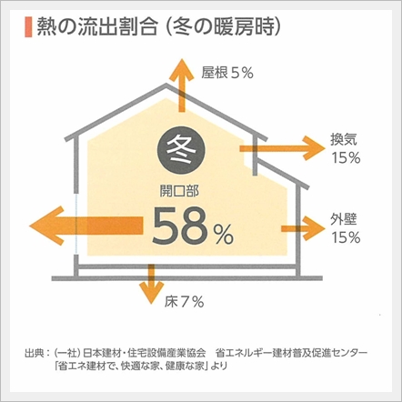 開口部(窓等)からの熱の流出割合は外壁面や屋根面よりも大きく、