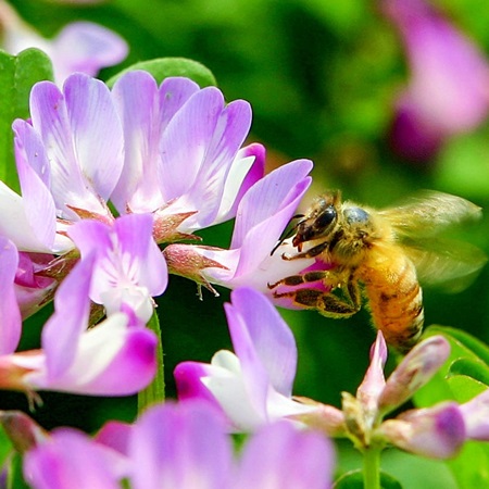 ミツバチが、蓮華草になんども顔を突っ込み、蜜を集めています。