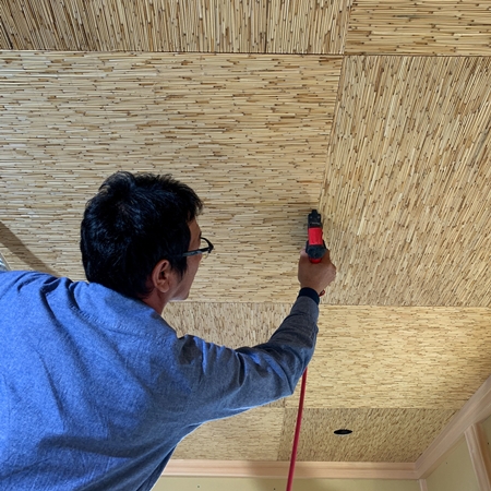 画像は、天井面に、【葦(よし)】で編まれた900mm角の材を、 【市松】張りしている状況写真です。