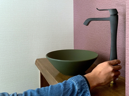 トイレ内の手洗い水鉢の位置について微調整しているところです。