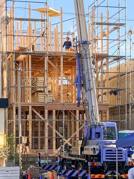 午後3時前には、3階部分の柱も殆どが建て込まれ、