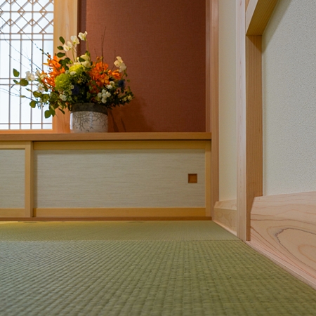 弊社では、畳寄せの部材の上に、 ヒノキ材の巾木部材を設計施工させて頂いております。