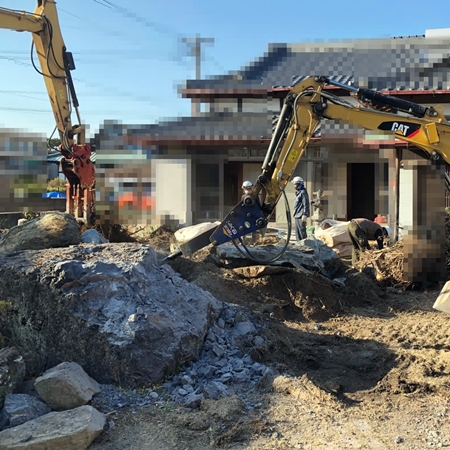 敷地内には大~きな池があり、 その池を構成していた大きな石の粉砕作業から取り掛かりました。