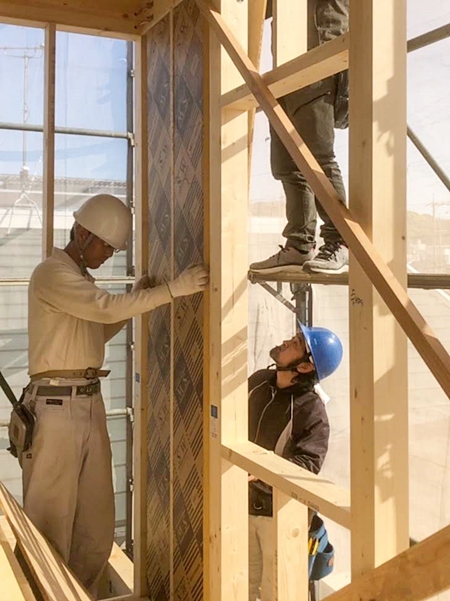 パネルを軸組(梁材と柱)に嵌め込み施工する前に、