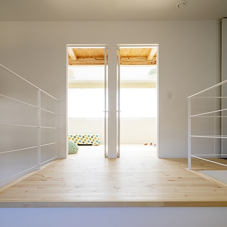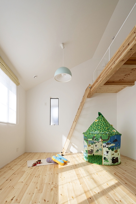 2 階にはあえて個室を作らず、将来間仕切り壁をたてて、簡単に個室にすることができる洋室