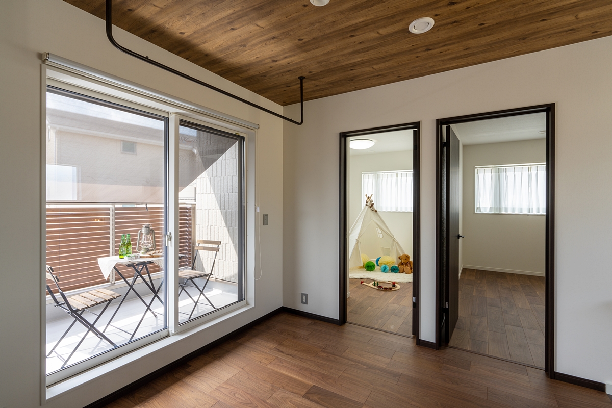 落ち着いた色味でまとめながら、アイアンや真鍮・ウッド系をポイントに使用することでスタイリッシュな印象に。更に考え抜かれた導線や間取りで玄関ホール・LDKなど要所にマッチした収納を設置することで片づけやすく、生活感を感じさせないスッキリとした家となっています。2階の階段ホールを広く取り、雨の日の物干しや小さいお子さんの遊び場として使用することもできるようにすることでとても自由度の高い空間ができました。2階ベランダに水道とコンセントを付け、ベランダで食事をしたり、夏はプールを置くこともできる空間に。スタイリッシュなリビングと、多目的な2階で1年中楽しめる住宅に仕上がりました。