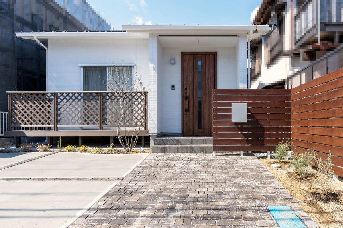 白い外壁とウッドデッキ・木質フェンスのコントラストが素敵です。