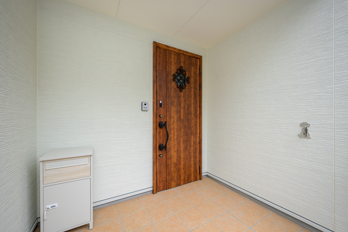 玄関ポーチは広くとり、宅配ボックスを設置。雨にも濡れず、犬用リードフックも壁付けして利便性の高いポーチとなりました。
