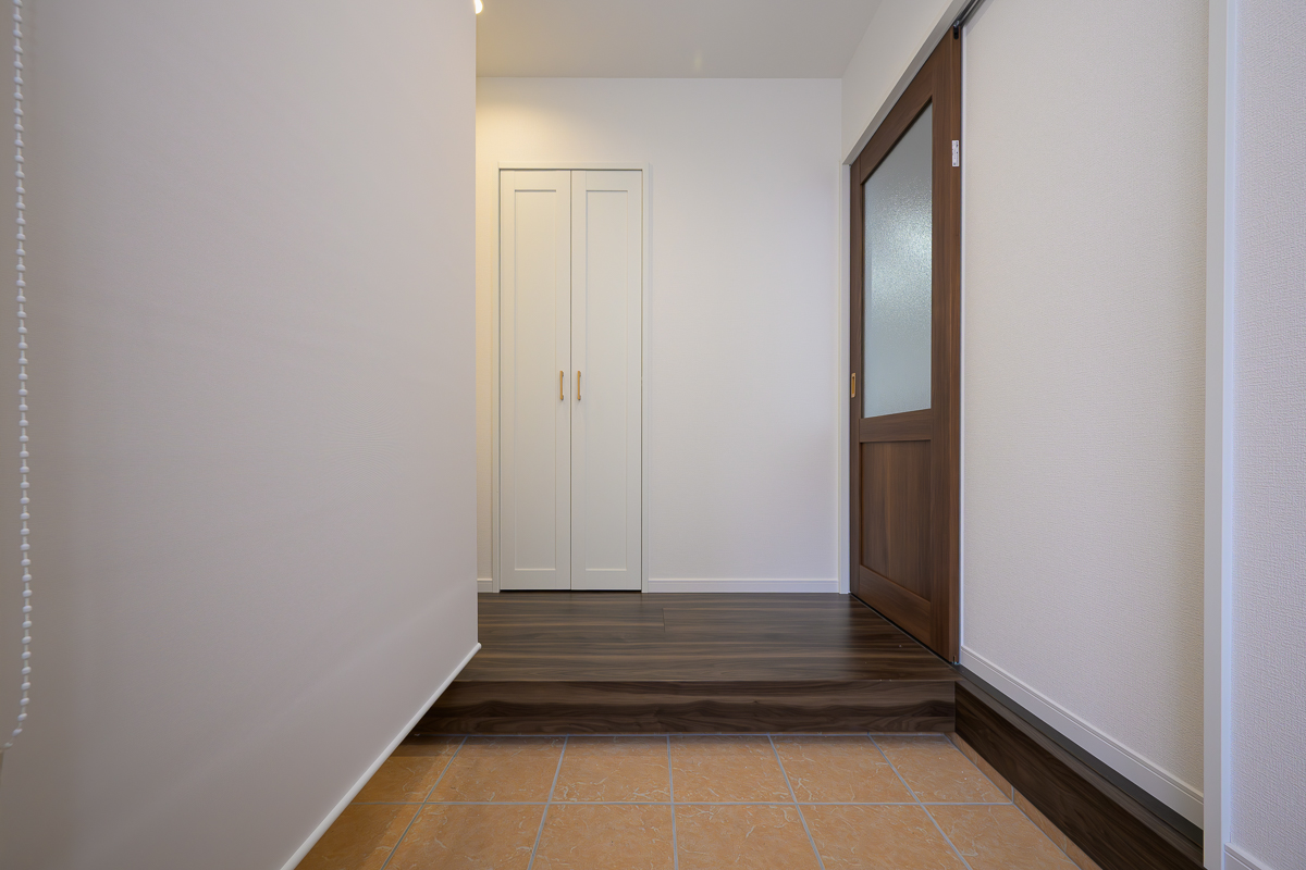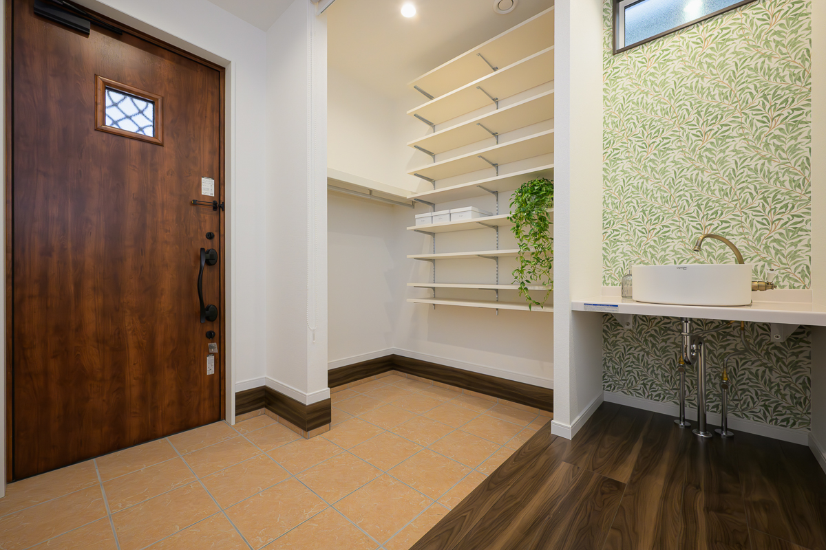 玄関ホールにはシューズクローク。そしてオシャレな手洗い水栓はインテリアのように馴染んでいます。