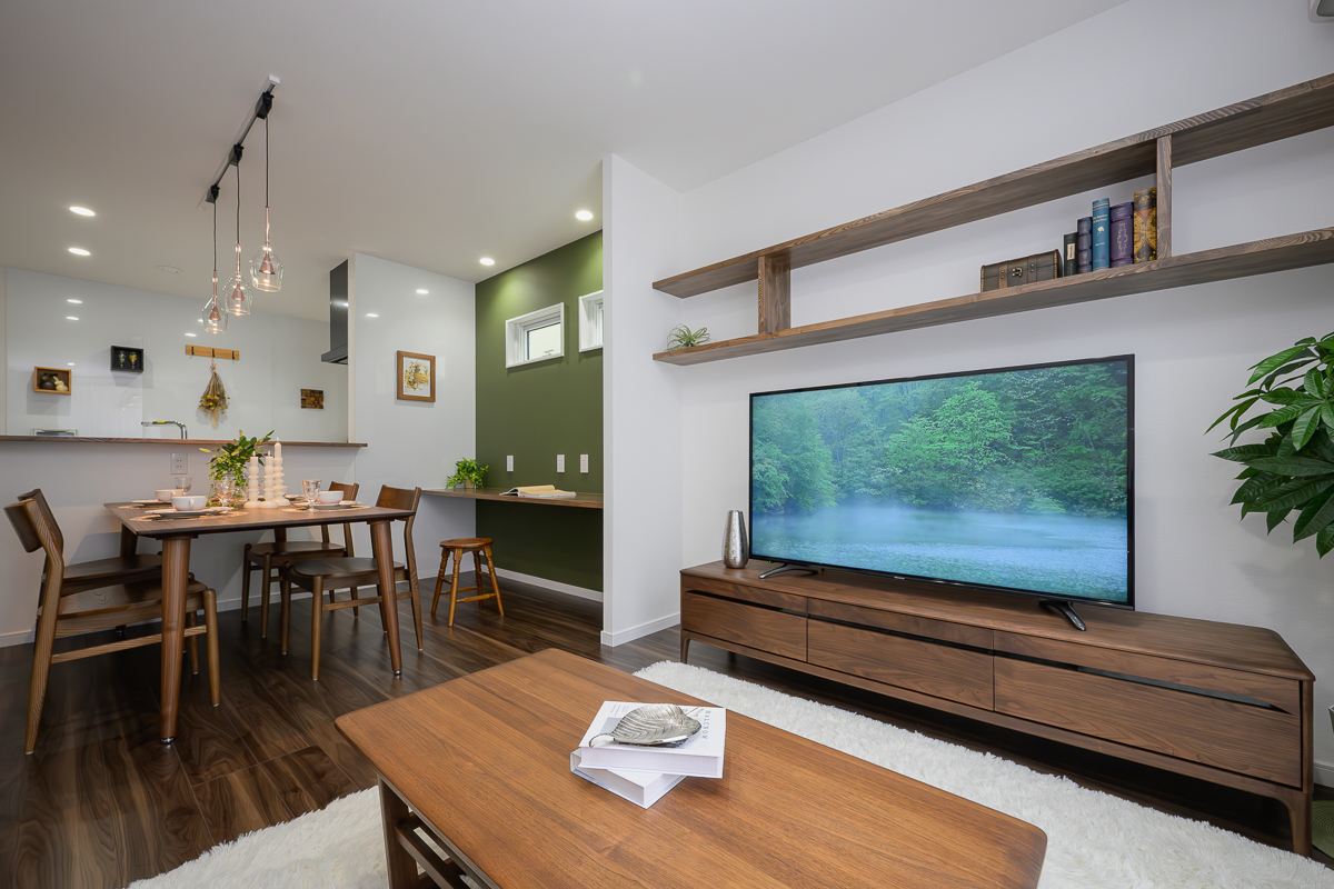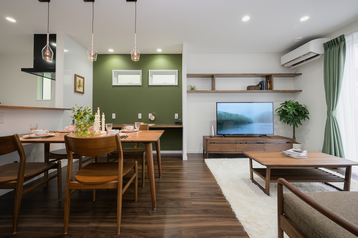 室内は濃い目の床材で落ち着いた雰囲気で仕上げました。