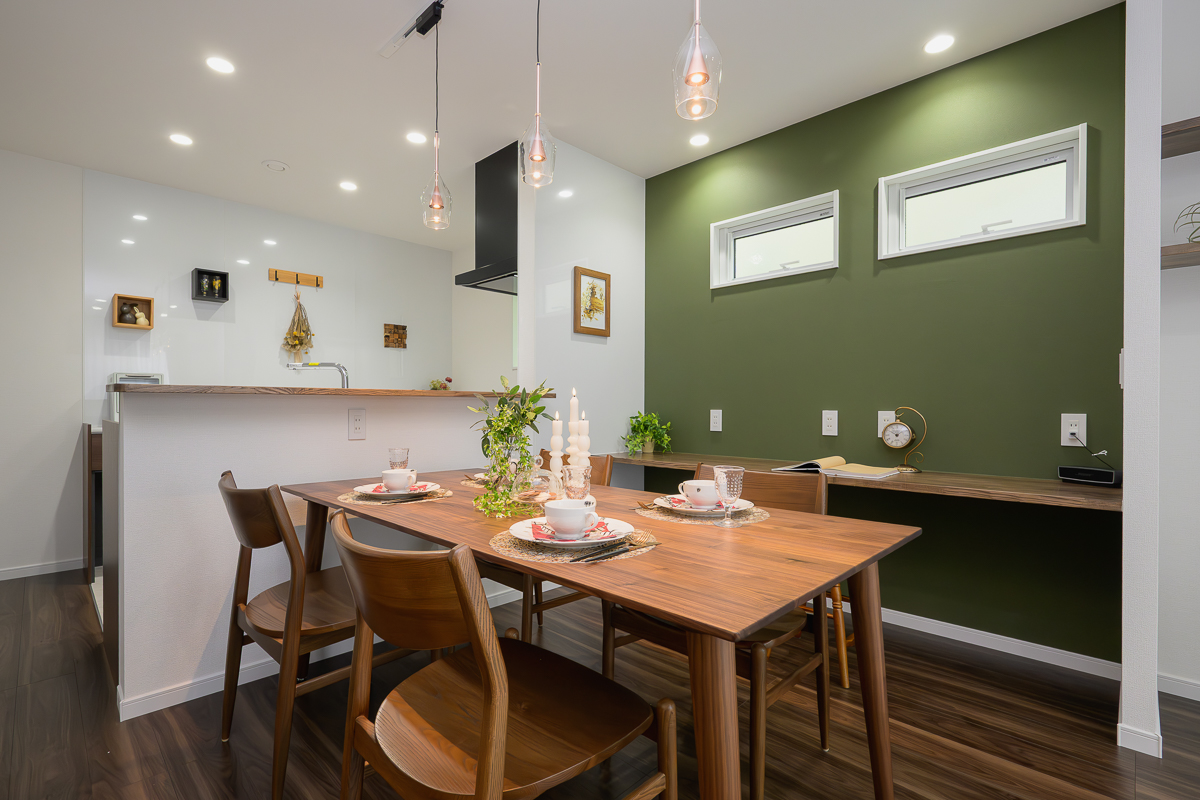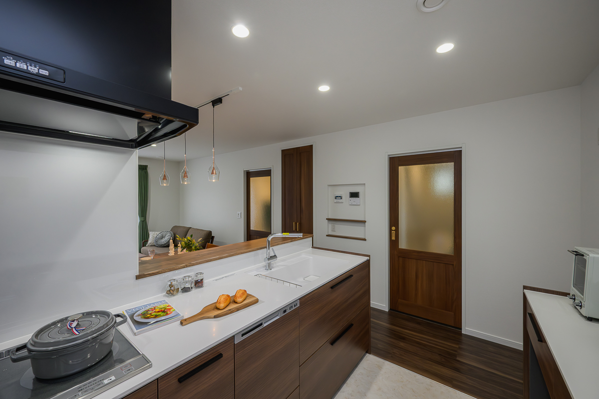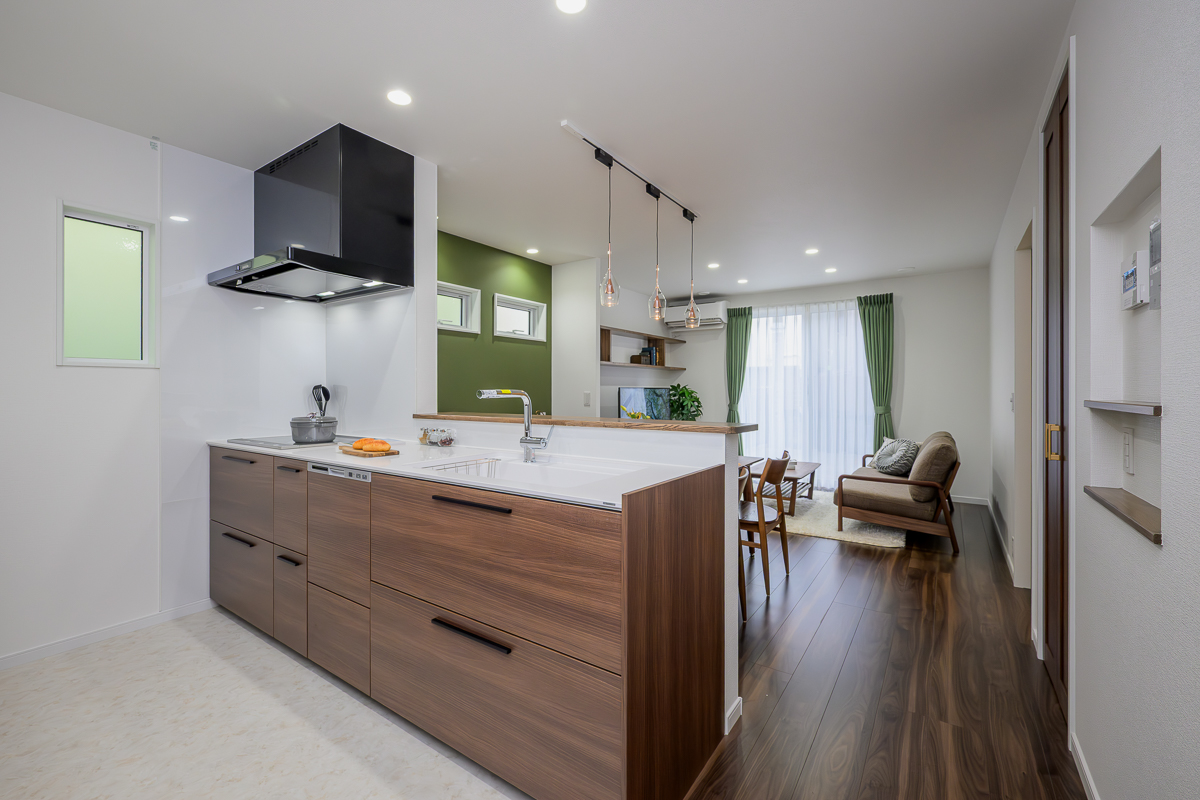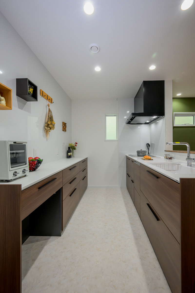 ホワイト×ダークブラウン、そしてグリーンがよく映えるキッチン。