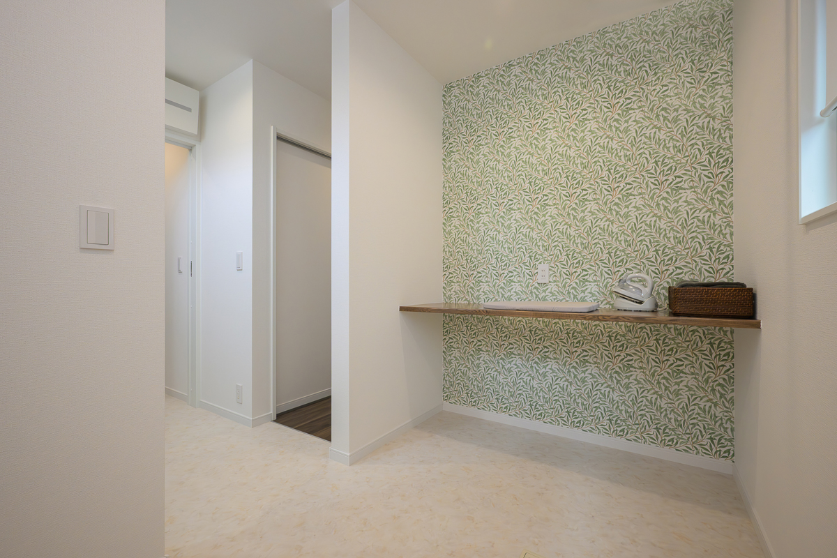 独立したランドリールーム。アイロンがけ用のカウンター、物干しを付けました。