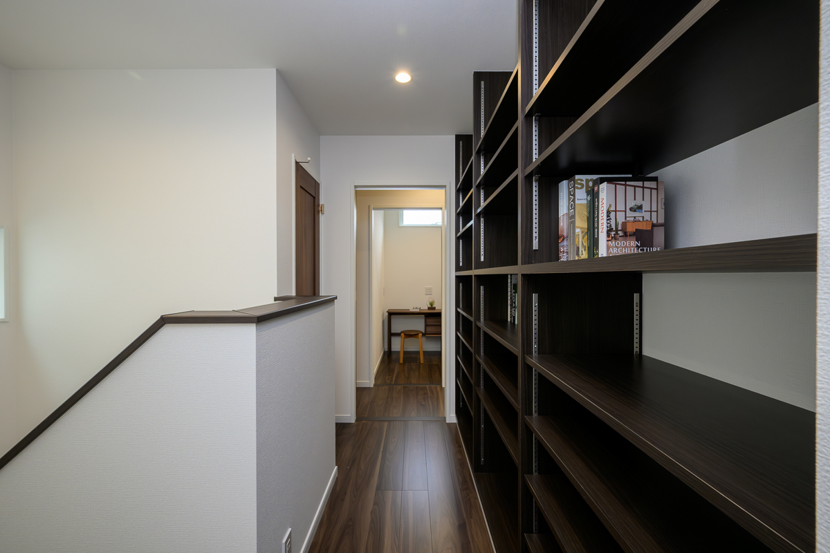 2Fに上がると広がるのは壁一面の本棚。廊下を有効活用、そして家族全員が使える特別な場所に‼