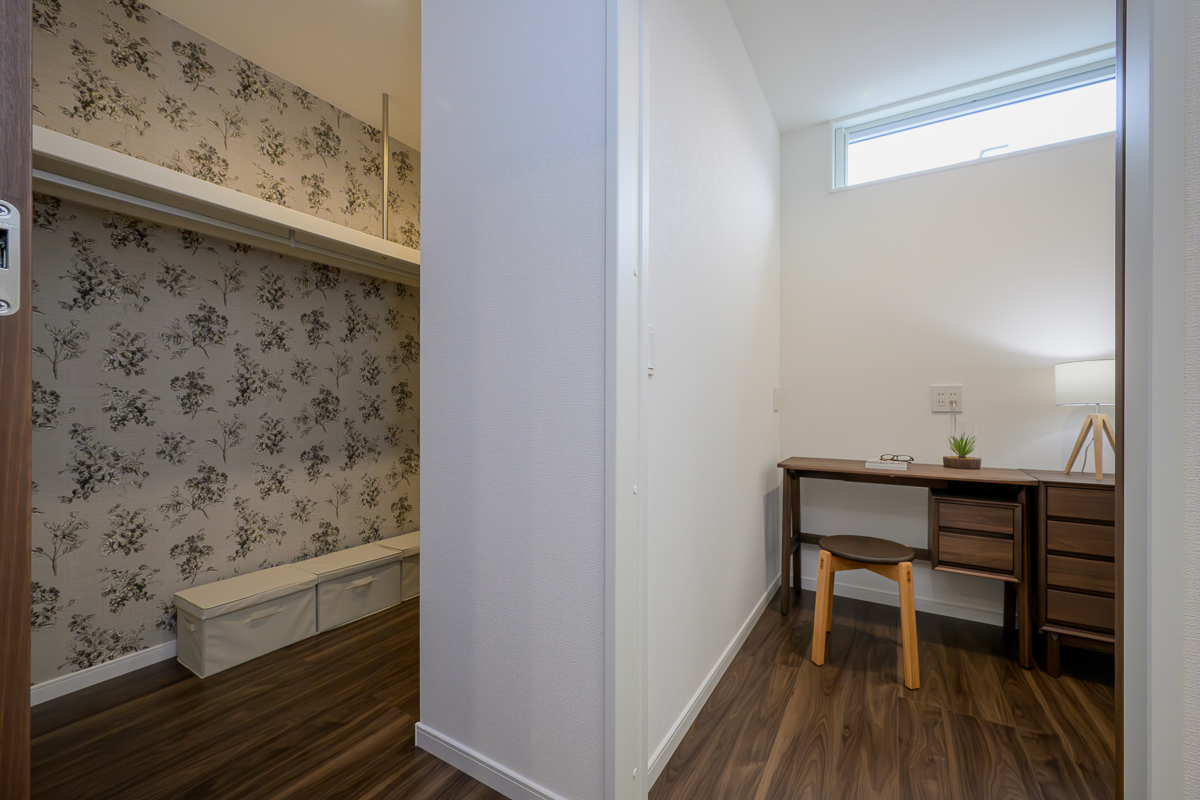 WICと書斎、そして右手に進むと主寝室が続いています。書斎は扉で仕切り独立した部屋として使用できます。