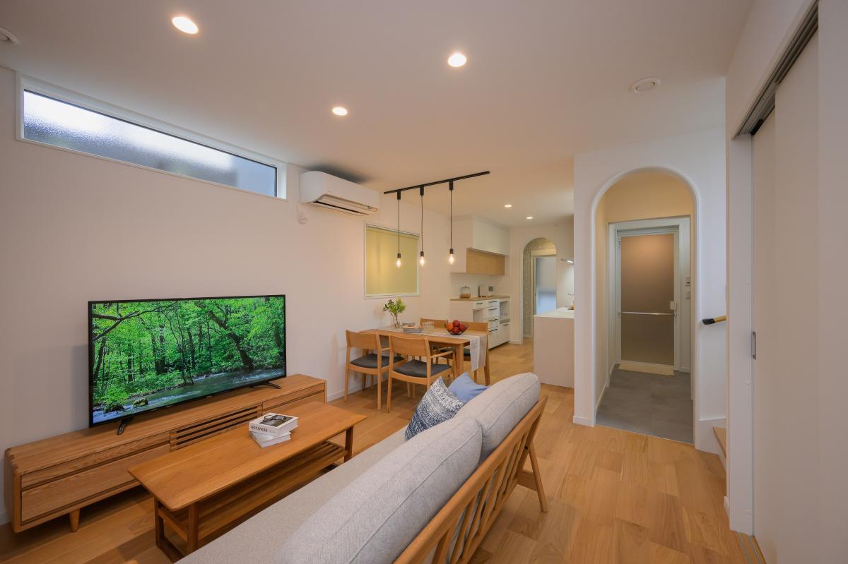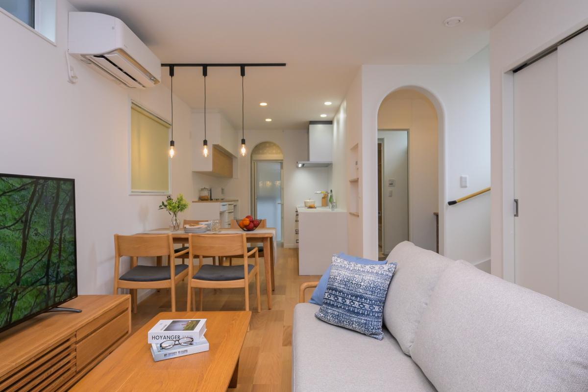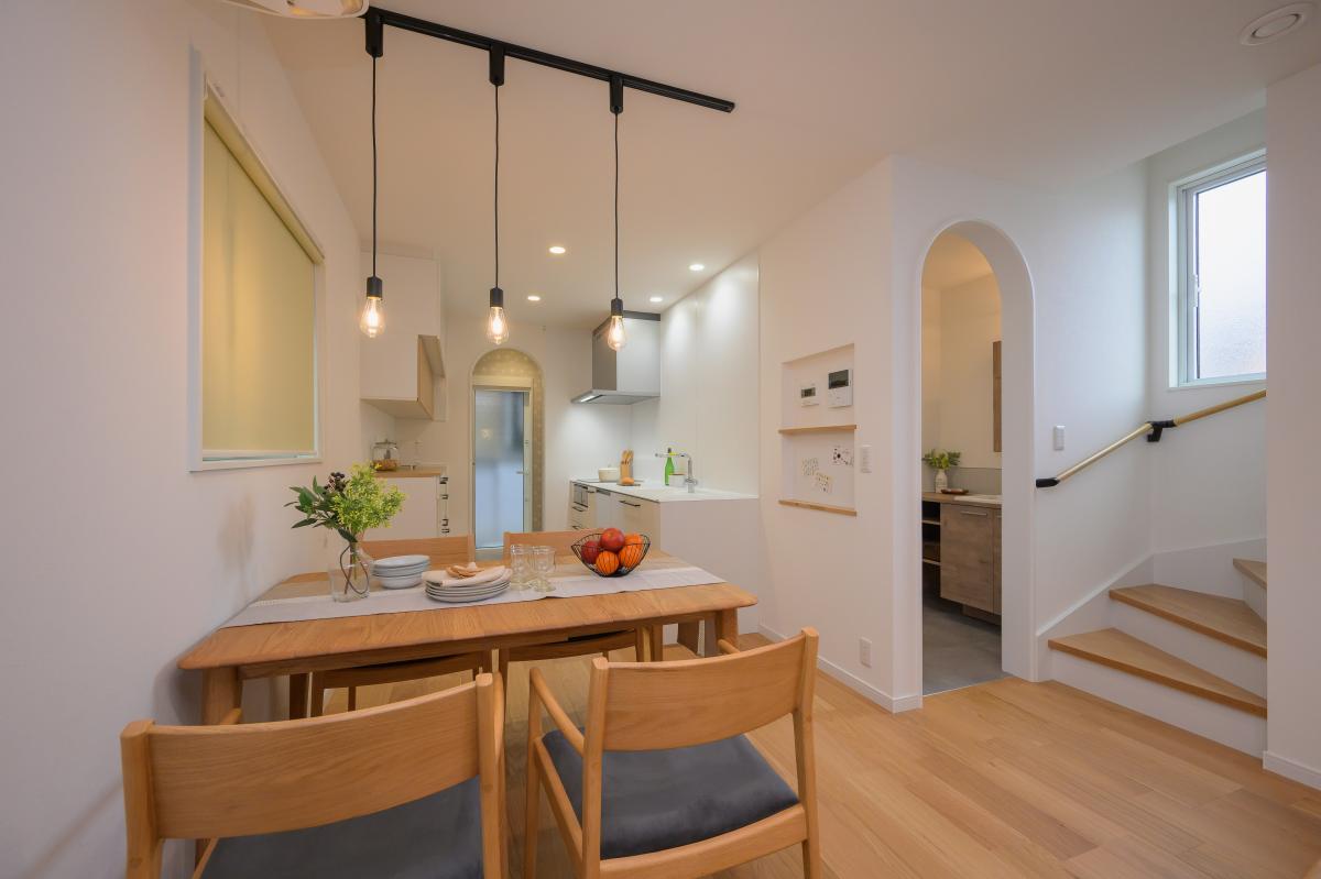 外観は落ち着きのあるネイビーカラーでまとめ、内観は一転して、木のぬくもりを感じるやさしく可愛らしいナチュラルな空間に。LDKから見える2つのアーチ型開口部はお施主様のお気に入りで、完成見学会でも多くの方に好評をいただきました。