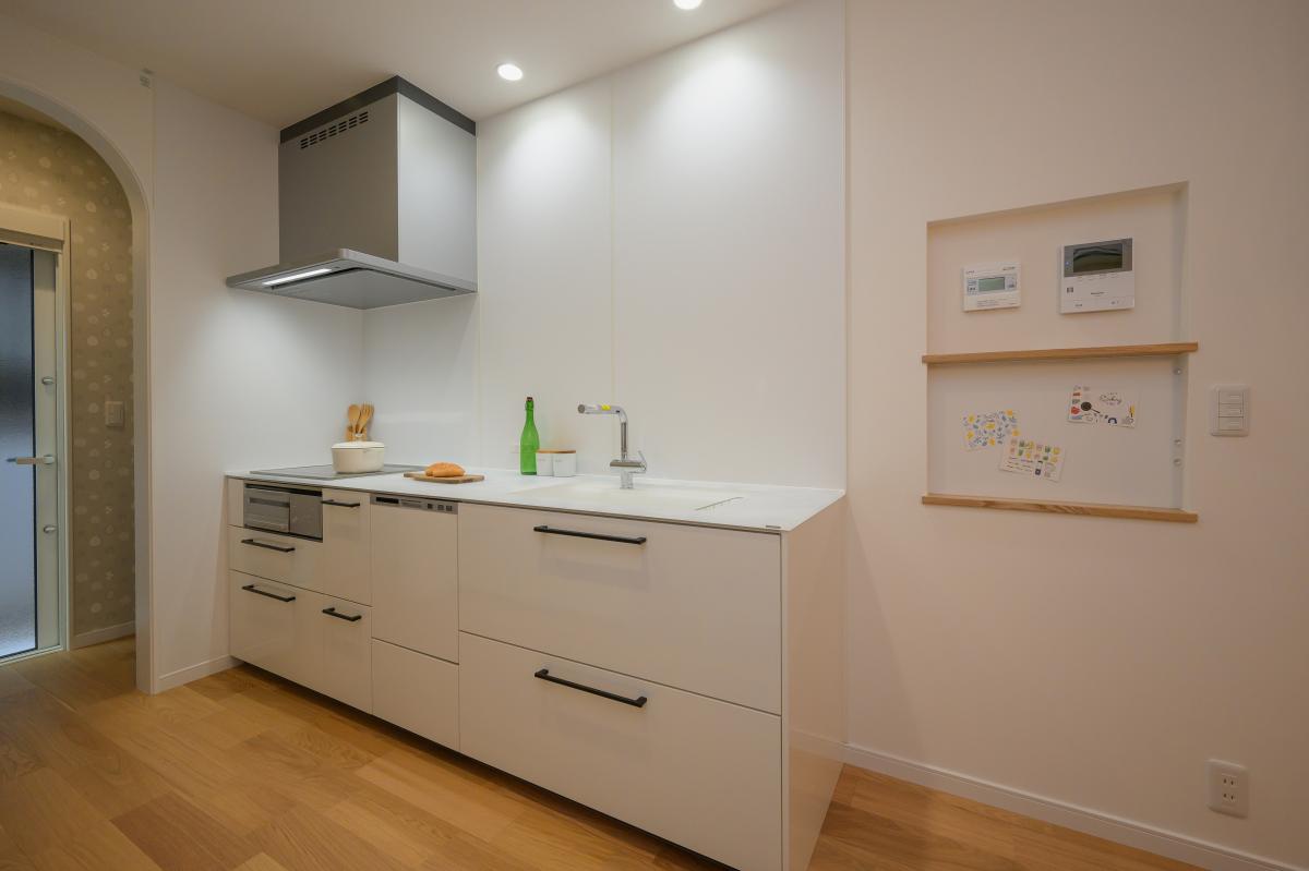キッチンは手元が明るくなるようにライトを配置。キッチン正面のパネルとキッチン横のニッチはマグネット対応。
