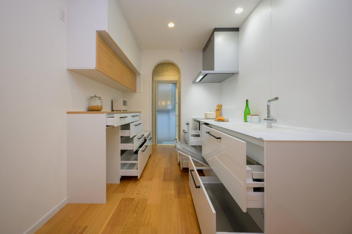 キッチンの収納力も十分‼吊り戸も2段に分かれており、使用頻度によって分けて収納すれば無駄なく使用可能。