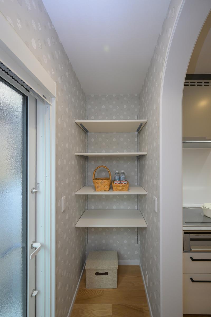 一番奥は両側パントリー。すりガラスの勝手口もあり、利便性+優しい光も入る設計に。
