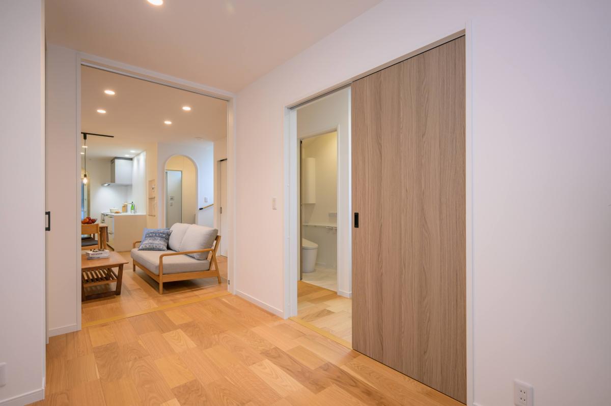 1階に居室がひとつ。扉を開ければリビングとひと続きとなり、広い空間として使用可能。